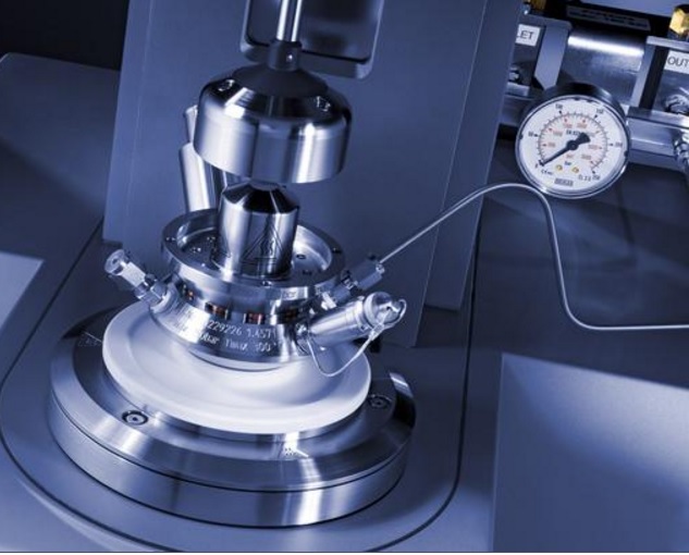 Despite the rheometer pressure cell itself we possess a large amount of accessories for measurements under pressure. Thus the rheometer cell can charged from a second pressure cell that is separated by means of a movable piston into two compartments. One side contains the sample while the other one is filled with hydraulic oil in order to establish the desired pressure. With this setup it is for example possible to perform measurements in fluid or supercritical gases (e.g. propane or CO2).
