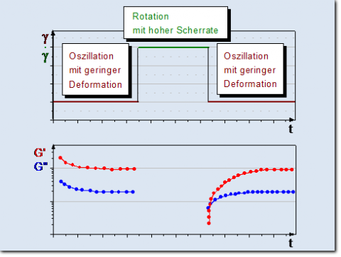 Der Test für den Strukturabbau und -wiederaufbau lässt sich vorteilhaft mit Oszillationsmessungen kombinieren. Die Ruhephase vor der Verarbeitung wird in Messabschnitt 1 als Oszillationsmessung mit kleiner Deformationsamplitude simuliert. Die Amplitude soll innerhalb des linear-viskoelastischen Bereiches (LVE) liegen, damit die Struktur der Probe in diesem Messabschnitt ungestört ist. Intervall 2 (Belastung) wird wieder als Rotation bei hoher Scherrate ausgeführt. Intervall 3 (Strukturerholung) wird wie Abschnitt 1 in Oszillation mit gleicher Frequenz und Amplitude durchgeführt. Im Unterschied zum Thixotropietest in Rotation (Rot-Rot-Rot), erhält man beim Test in der Variante Osz-Rot-Osz auch Informationen zum Wiederaufbau der Elastizität, indem man den Verlauf vom Speichermodul G' im Erholungsabschnitt betrachtet.